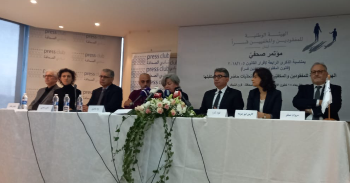 وطنية - عقدت الهيئة الوطنية للمفقودين والمخفيين قسرا، مؤتمرا صحافيا في نادي الصحافة، وهو الاول لمناسبة الذكرى الرابعة لصدور قانون المفقودين والمخفيين قسرا القانون 105/2018، حضره النائب أنطوان حبشي، موريس الجميل ممثلا النائب سامي الجميل، جوزيف الحلو ممثلا النائب جبران باسيل، وممثلة عن النائب ابراهيم منيمنة، الكولونيل هيثم فياض ممثلا محافظ بيروت القاضي مروان عبود، نائب رئيس الهيئة الوطنية، الرئيس بالانابة، ممثل مجلس عمداء الجامعة اللبنانية الدكتور زياد عاشور، والأعضاء الثلاثة الجدد للهيئة مروان صقر عن نقابة بيروت وفواز زكريا عن نقابة محامي طرابلس، الدكتور ناجي صعيبي ممثلا نقابتي الأطباء في بيروت وطرابلس، الدكتورة كارمن أبو جودة وأديب نعمة عن هيئات المجتمع المدني، الدكتورة جويس نصار ورئيسة لجنة اهالي المخطوفين والمفقودين في لبنان وداد حلواني عن أهالي المفقودين والمخفيين قسرا ، اضافة الى ممثلين عن البعثات الدبيلوماسية المعتمدة في لبنان ووكالات الامم المتحدة في لبنان والمنظمات الدولية والمحلية وحشد من الاهالي.